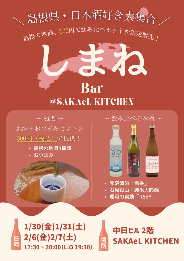 島根県の酒造、「一宮酒造」さんの手掛ける日本酒を、3種のみ比べ+島根のおつまみ付き、500円(税込)でご提供する「しまねBar」を開催します。